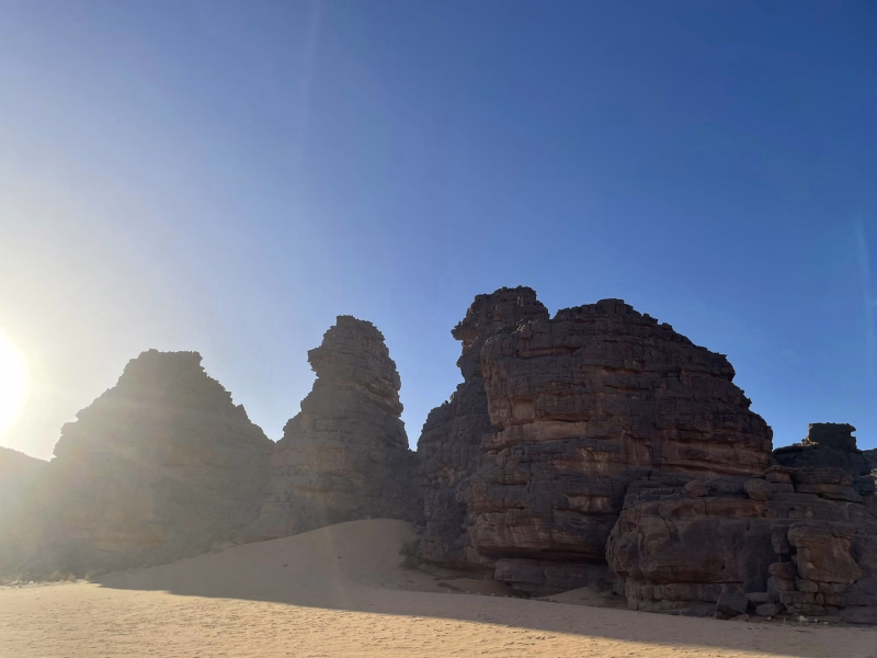 La journée s’ouvre entre découvertes et partages, sous les premiers rayons du soleil qui illuminent votre dernière journée dans le désert. Après un petit-déjeuner chaleureux, nous prenons la route du retour vers Djanet, mais le voyage nous réserve encore une merveille : les dunes majestueuses de l’Erg Admer. Nous marchons au cœur d’un décor saisissant, entre pitons rocheux aux formes étranges et dunes dorées. Puis, l’équipe nous retrouve pour un repas nomade, simple et joyeux — un moment suspendu, empreint d’amitié et de gratitude.