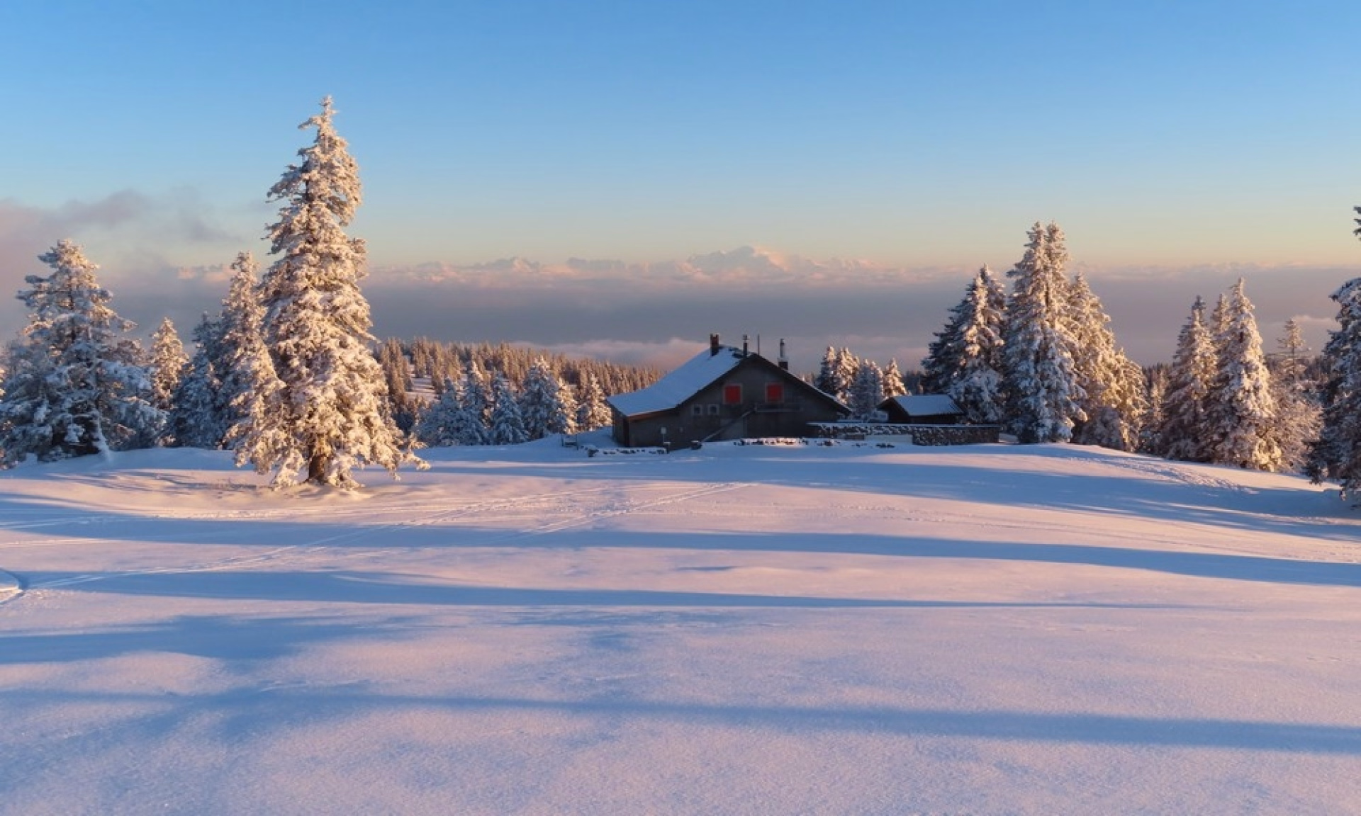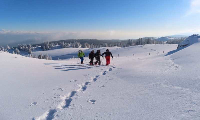 Évoluant souvent au-dessus de 1 400 mètres d’altitude, l’itinéraire bénéficie généralement d’un enneigement généreux, offrant des conditions idéales pour la pratique de la raquette. À chaque pas, la sensation de dépaysement s’intensifie. Les crêts jurassiens, longues crêtes arrondies typiques du massif, dessinent un horizon apaisant et invitent à la contemplation.