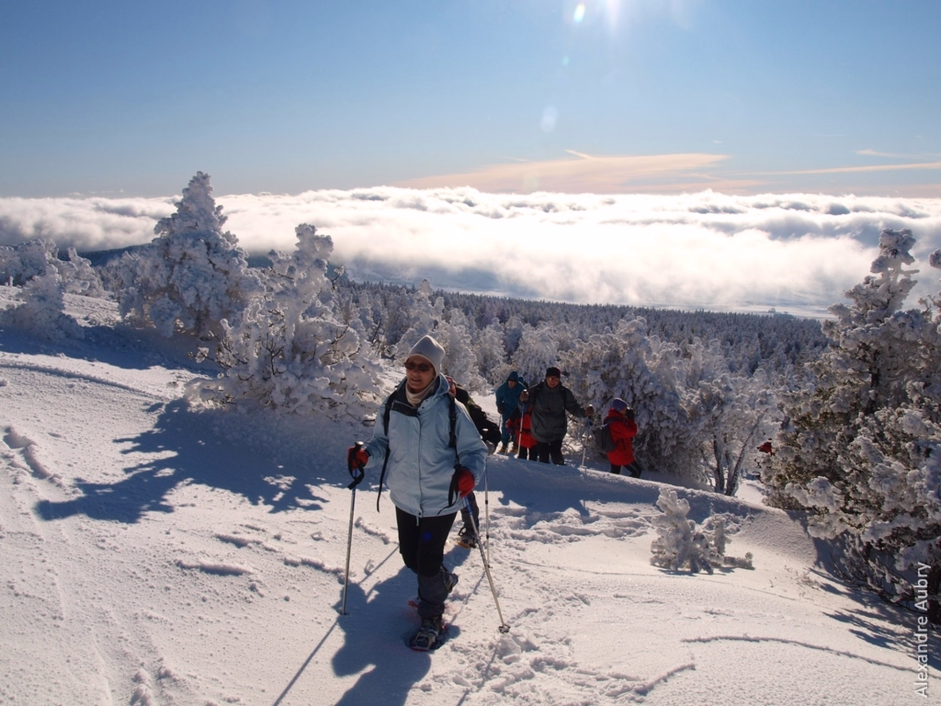 C'est parti pour l'ascension du mont Mézenc, le "géant des Cévennes" ! Même s'il est l'un des plus hauts sommets du massif Central, son ascension n'est pas très difficile et offre aux courageux un panorama extraordinaire sur toute la chaine des Alpes et les sommets d'Auvergne, si la météo nous le permet bien entendu ! Si le vent a soufflé les jours précédents, vous admirez les pins recouverts de neige, semblables à des sculptures éphémères.