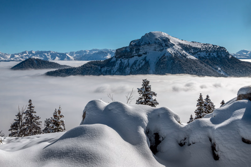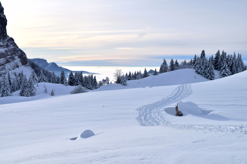 L’ascension du Petit Som ouvre le bal, dévoilant une vue spectaculaire sur les sommets alentour. Vous enchaînerez avec les crêtes de Mont Fromage, offrant une progression aérienne sur fond de blancheur éclatante. Les hauts plateaux invitent à la contemplation, dans une atmosphère de calme absolu. L’itinéraire se poursuit dans la vallée des Entremonts, où se mêlent hameaux authentiques et paysages de carte postale.