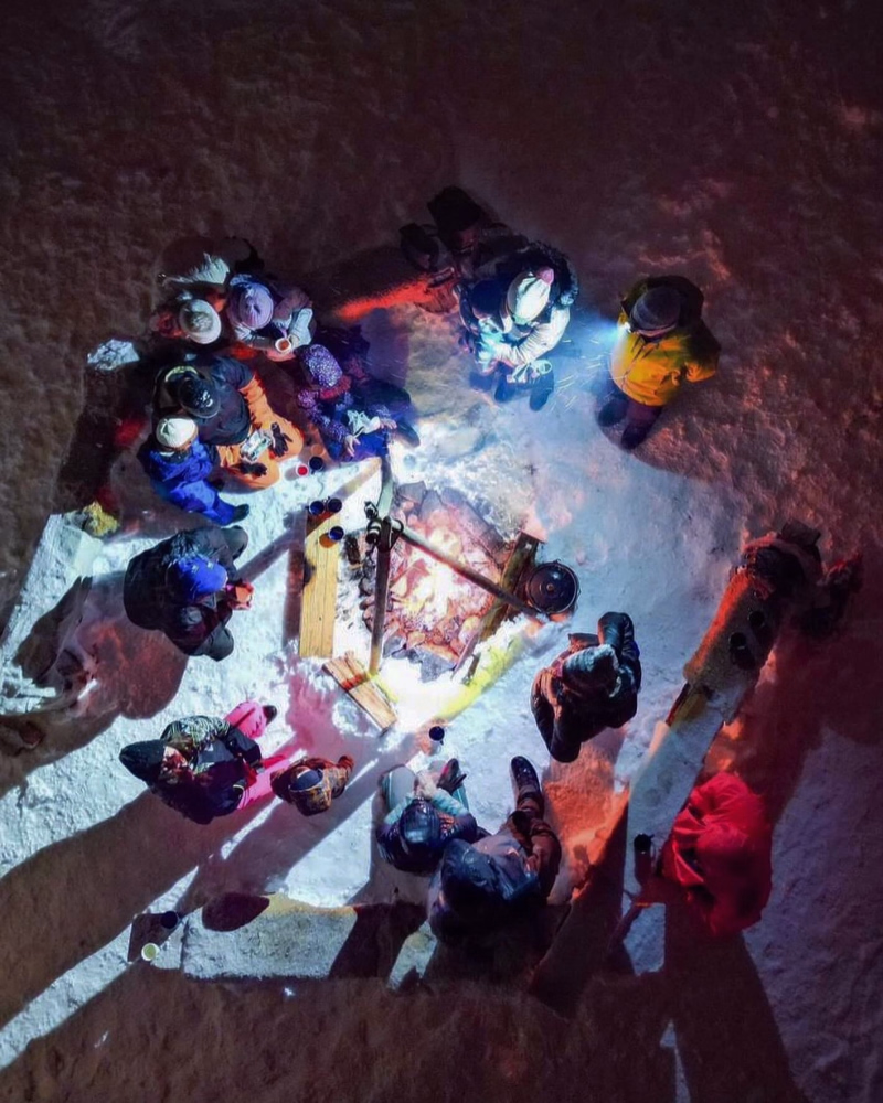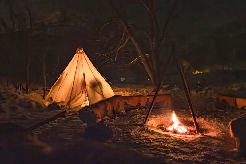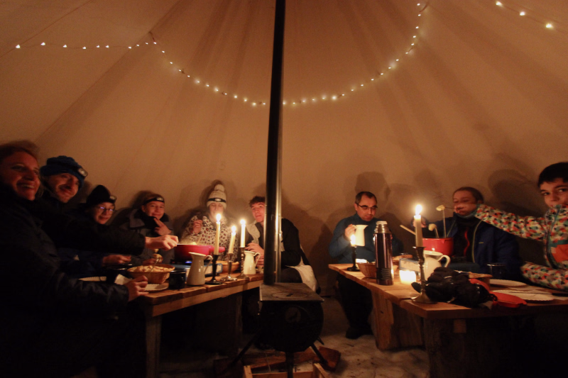 Nous partons à la nuit tombante pour une balade en raquette d’environ 30 à 40 minutes en fonction des conditions météo. Arrivée au camp trappeur, nous prenons un petit apéro vin chaud autour du feu puis nous dégustons une délicieuse fondue au fromage, suivie d’un dessert. La soirée continue autour du feu, avant de passer une nuit insolite dans un tipi chauffé par le poêle à bois.