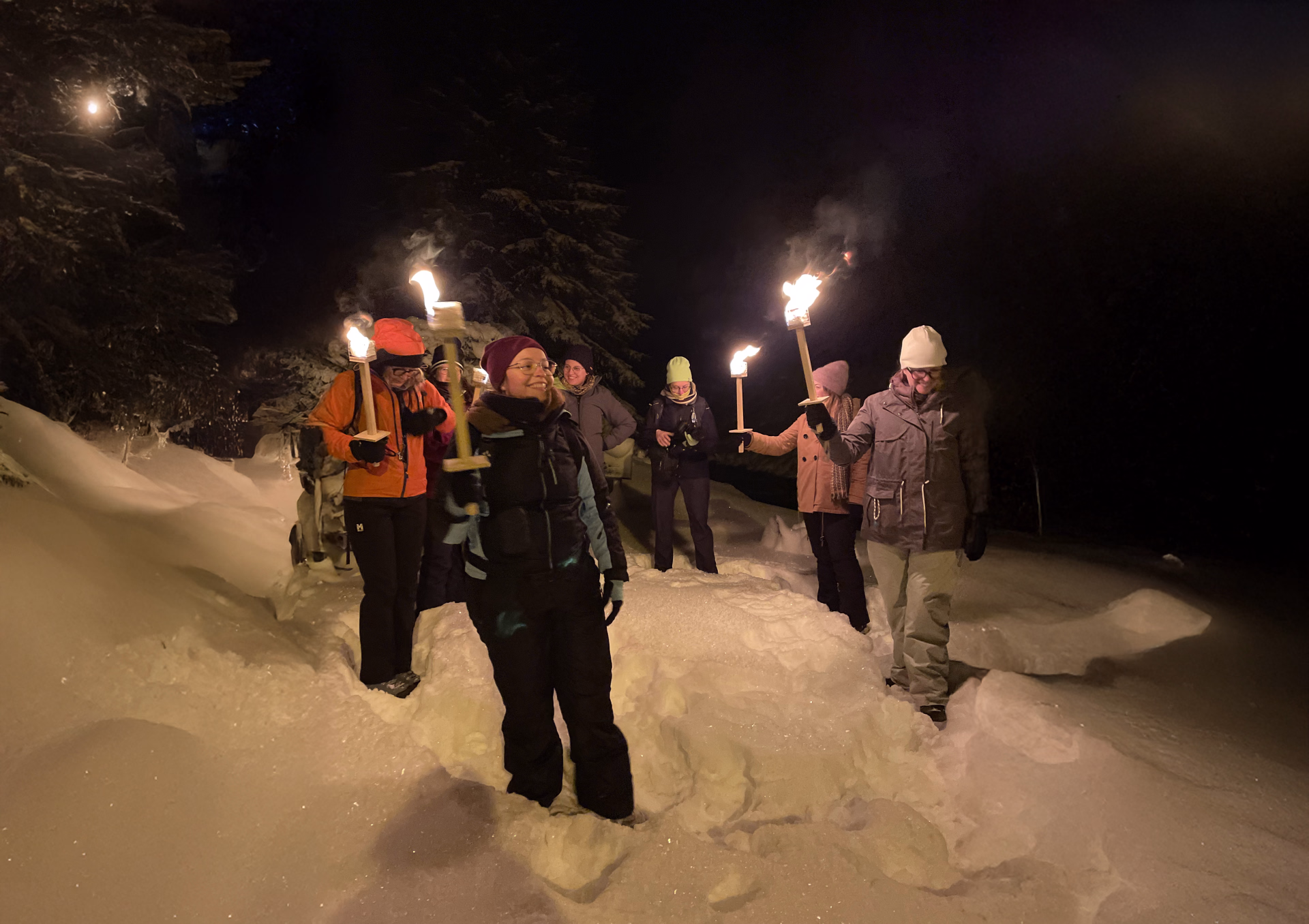 En soirée, surprise magique : balade aux flambeaux dans la nuit étoilée pour clôturer cette journée d'immersion intense. Le silence de la montagne nocturne, la lumière dansante des flammes, l'air glacé sur votre visage - un moment hors du temps.