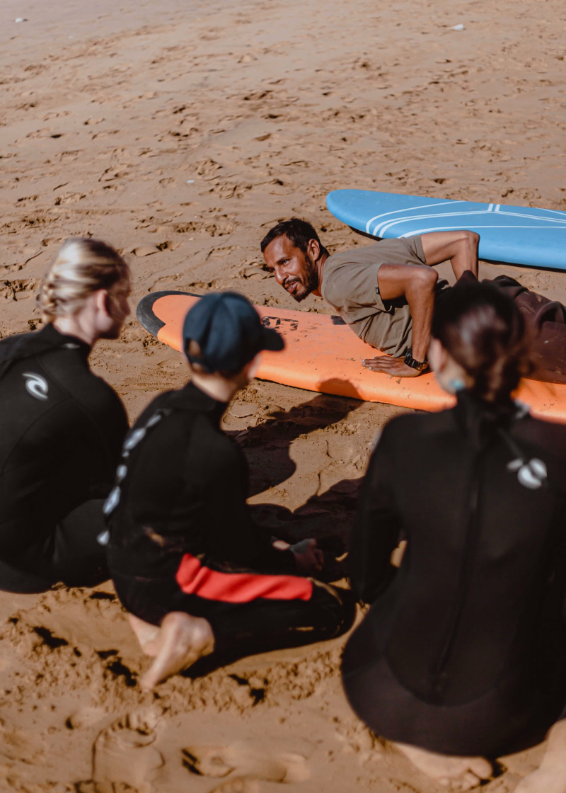 Notre équipe de surf est l’une des plus qualifiées. Hamada, Mehdi et Moncef sont tous les trois nés ici, au cœur des spots où ils surfent depuis l’enfance. La combinaison de leurs expériences, leur bienveillance et leur professionnalisme vous permettent d'apprendre le surf, progresser vraiment et vous sentir en totale sécurité dans l’eau.