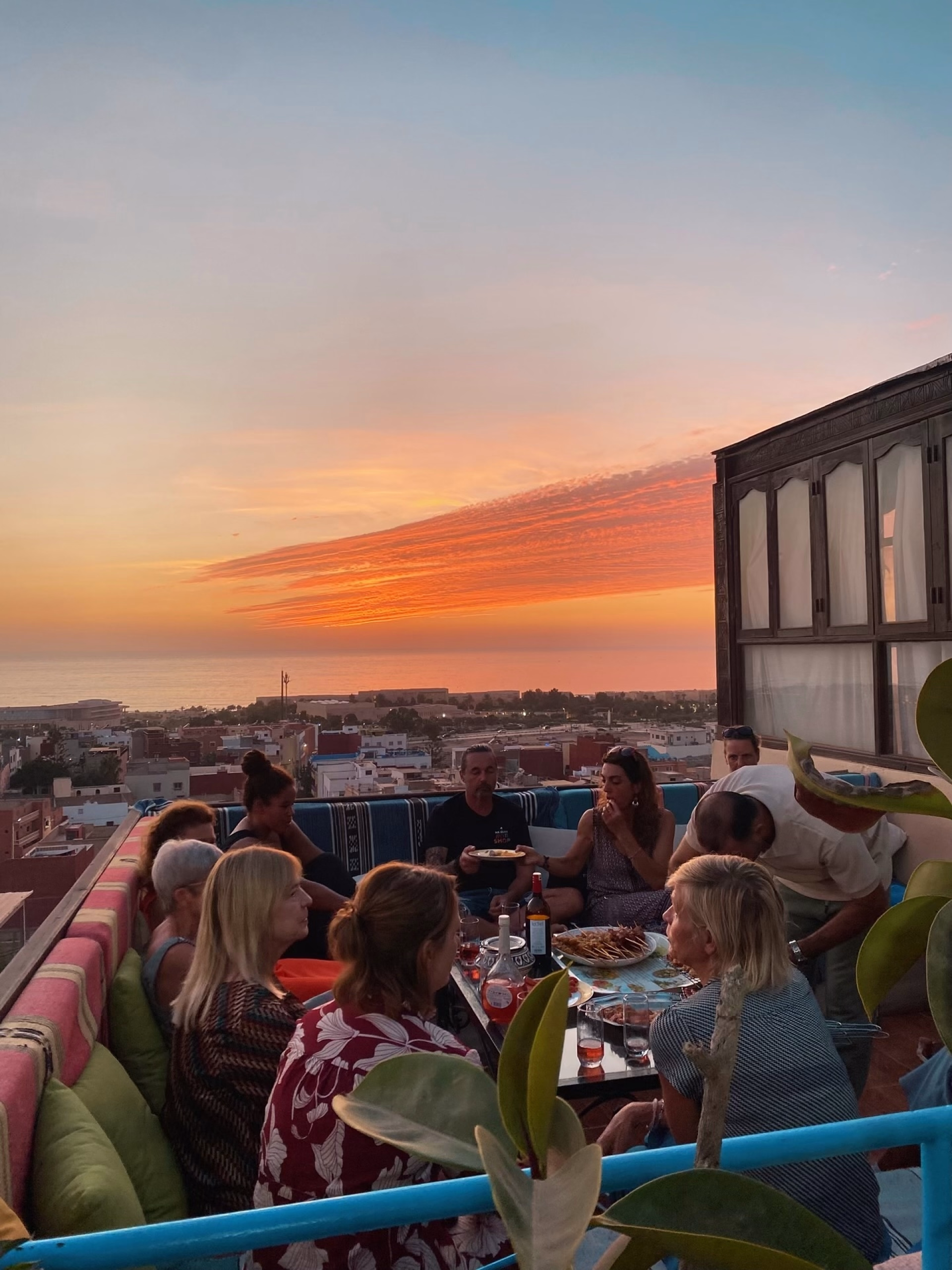 Entre deux vagues, profitez des repas faits maison 🍲, de la terrasse avec vue sur l’océan 🌅 et de moments de détente au rythme du coucher de soleil 🌇. Une expérience conviviale, sportive 💪 et dépaysante, où chaque journée est rythmée par le surf, le partage 🤝 et la découverte du Maroc ✨.