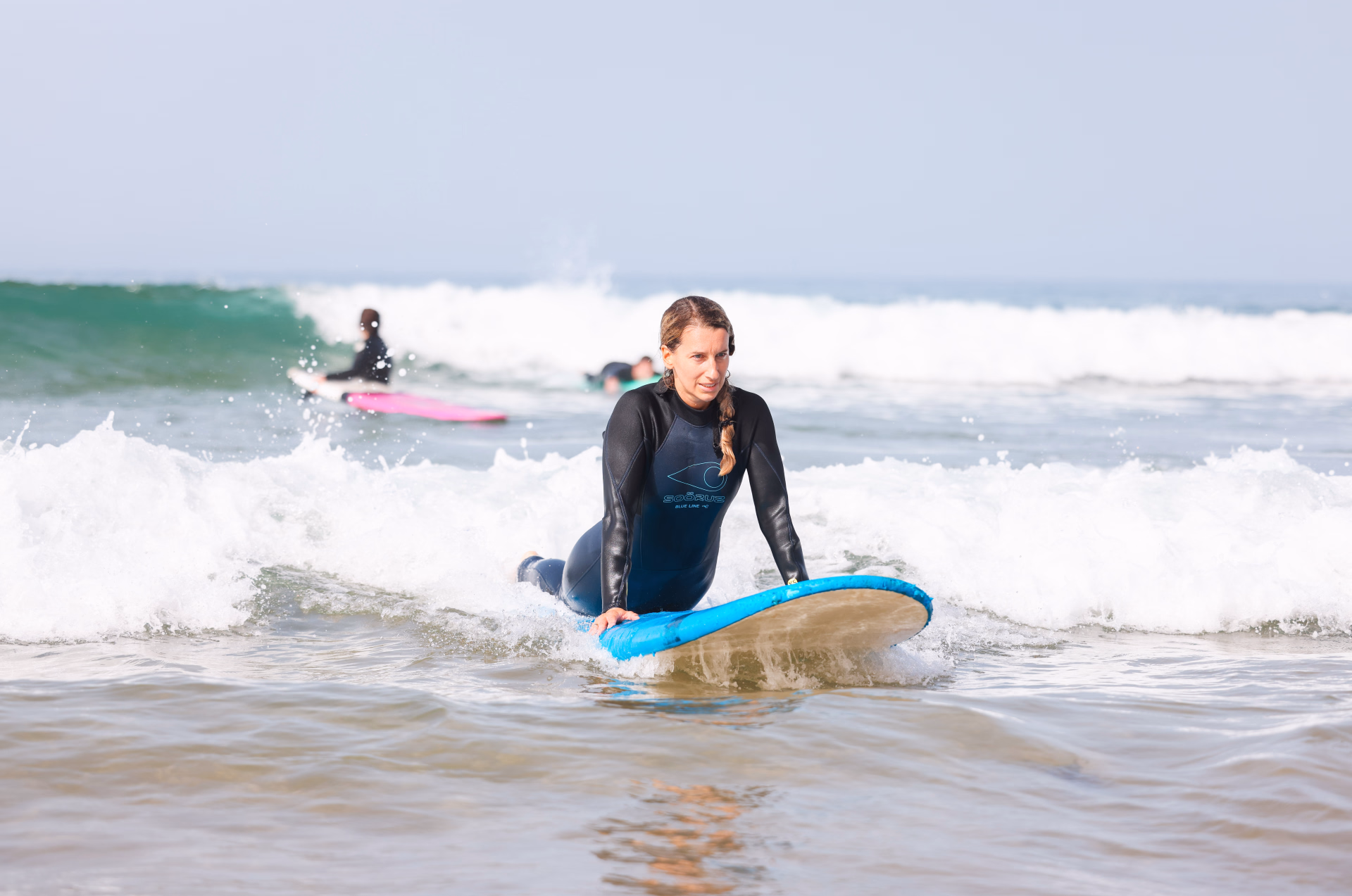 Vous évoluez dans la zone de mousse avec de l'eau jusqu'à la taille. Cet espace proche du bord est le lieu approprié pour débuter, les vagues y sont faciles et douces, et pour le rejoindre, il n'est pas nécessaire de ramer.