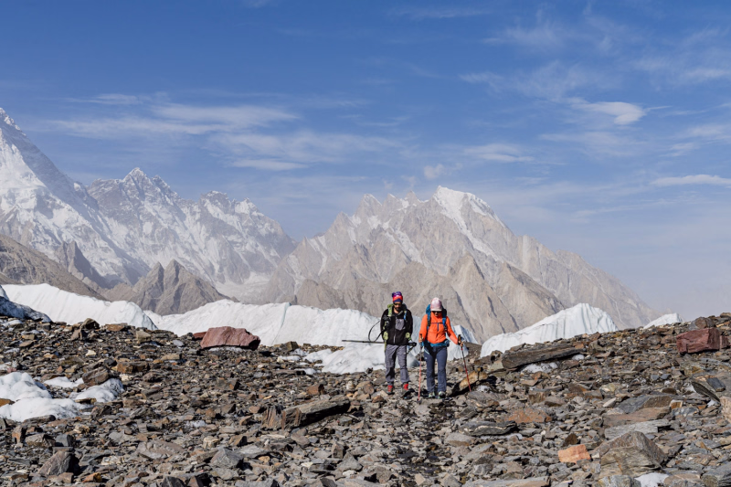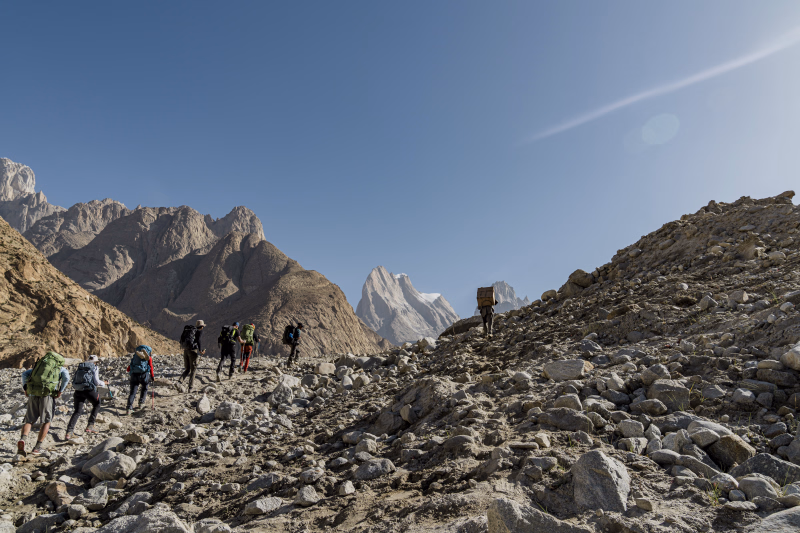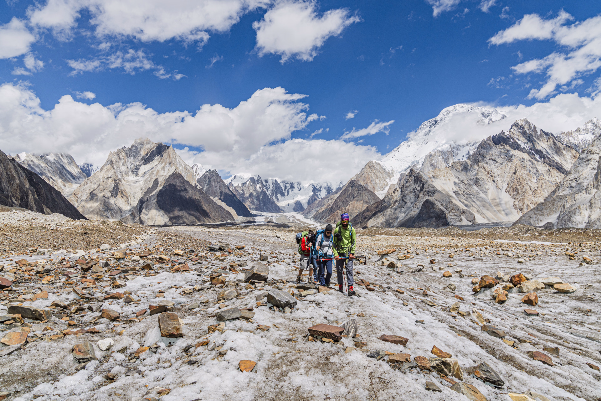 Nous continuons notre progression jusqu’à la confluence des glaciers de Biafo et du Baltoro, où nous installons notre camp pour la nuit. Le Bakhor Das (5 809 m) se dresse majestueusement au-dessus de nous.