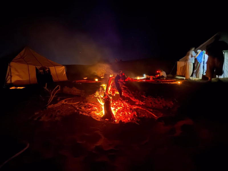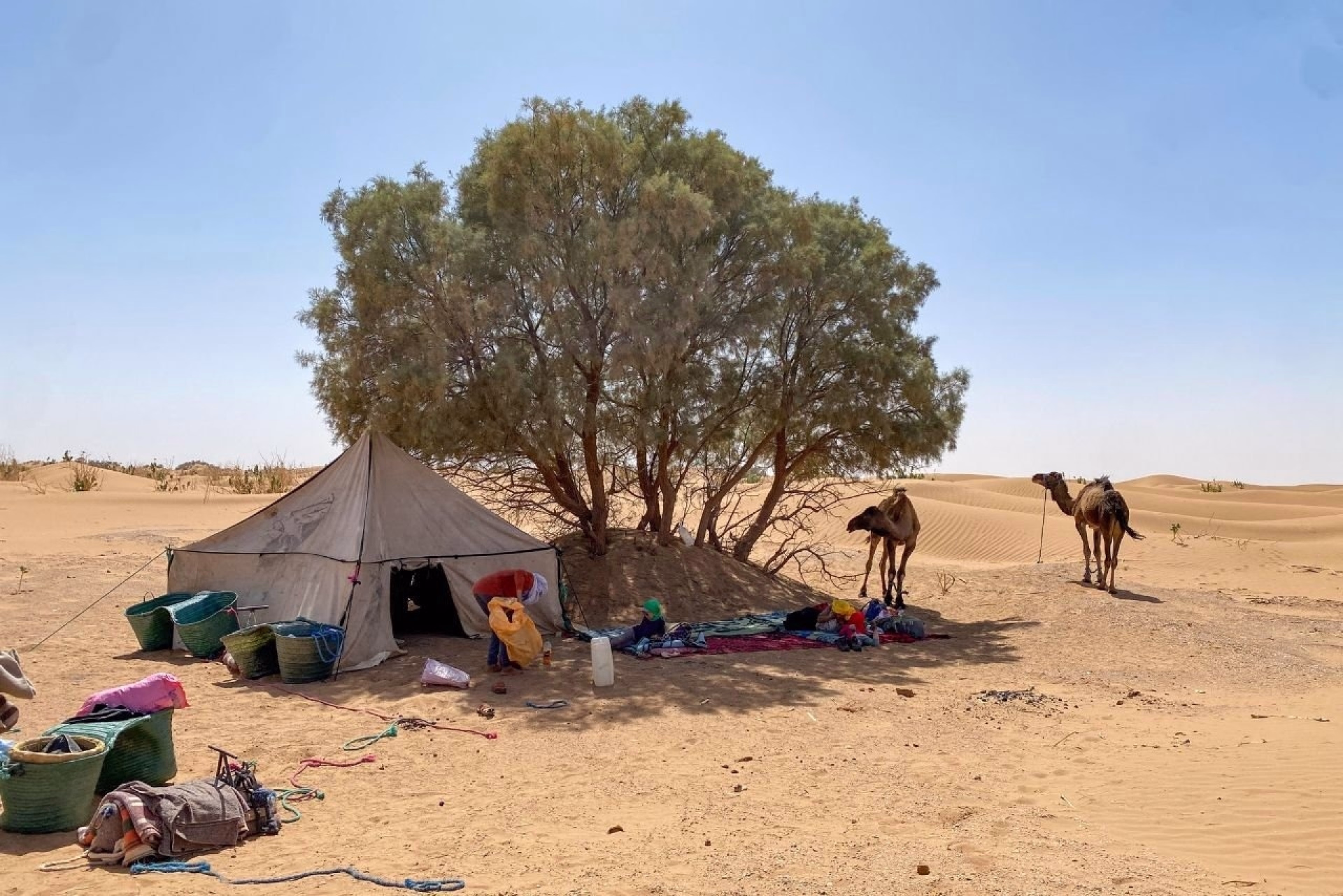 Tôt le matin, après le petit-déjeuner, nous chargeons le campement portable à dos de dromadaires. Au rythme du soleil, le camp se replie. Nous partons ensuite à travers les dunes, cherchant des sentiers faciles pour éviter les obstacles formés par les grandes dunes de sable. Nous traversons ensuite un vaste lac asséché et des zones de maquis. Tout au long du chemin, les vues sont imprenables et vous découvrirez comment le désert se transforme d'une zone à l'autre et comment les nomades ont appris à s'y repérer, jusqu'à atteindre les magnifiques dunes de l'Erg Zahar (surnommées les « dunes hurlantes »). Nuit dans le désert du Sahara, sous une tente ou à la belle étoile. L'Erg Zahar est le site de dunes numéro un du Sahara marocain grâce à son cadre naturel préservé, sans campements fixes ni tourisme de masse. C'est une destination incontournable pour les randonneurs, un lieu unique avec ses dunes orangées. Le déjeuner sera servi après le montage du campement dans vos tentes nomades.