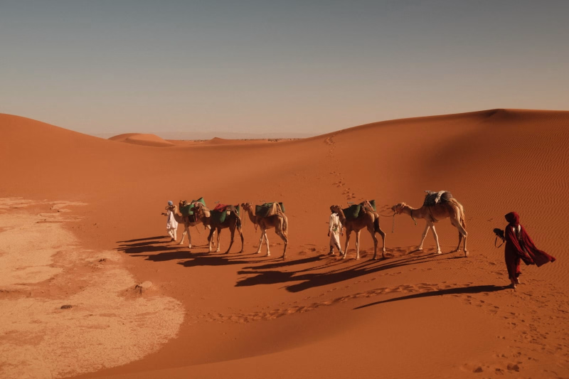 Depuis M'hamid, entamez votre trek au cœur du Sahara marocain avec les dromaadaires. Traversez d'immenses dunes de sable, des lacs asséchés et des bosquets de tamaris, tout en perçant les secrets du désert auprès de guides berbères expérimentés. Passez des nuits dans d'authentiques campements, savourez des repas traditionnels et imprégnez-vous de la sérénité du désert sous un ciel étoilé. Ce court trekking est idéal pour ceux qui recherchent une expérience marocaine à la fois écologique, culturelle et riche en aventures.