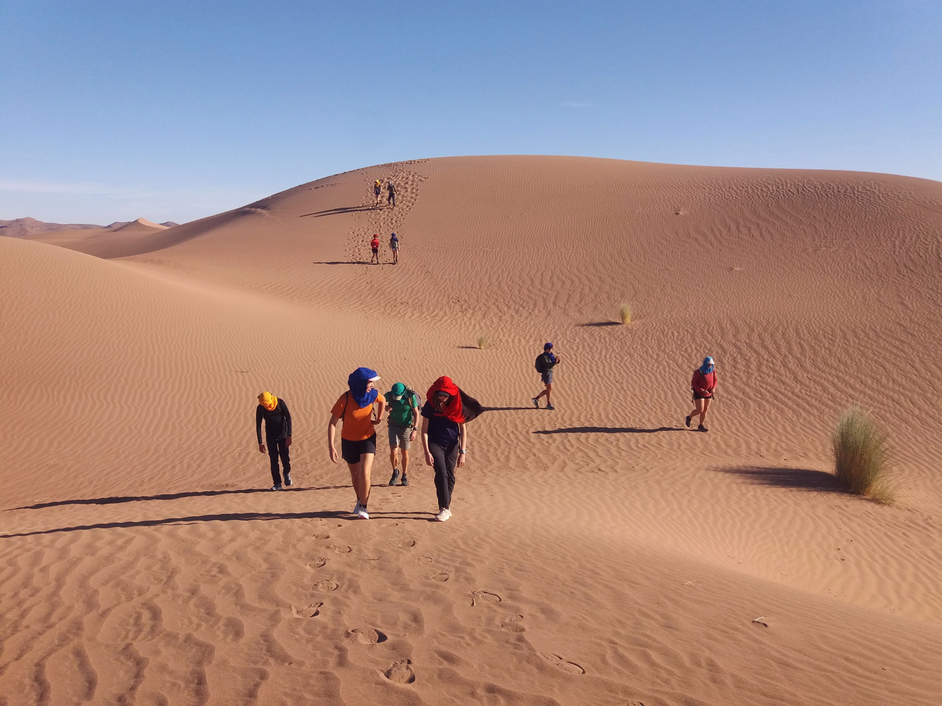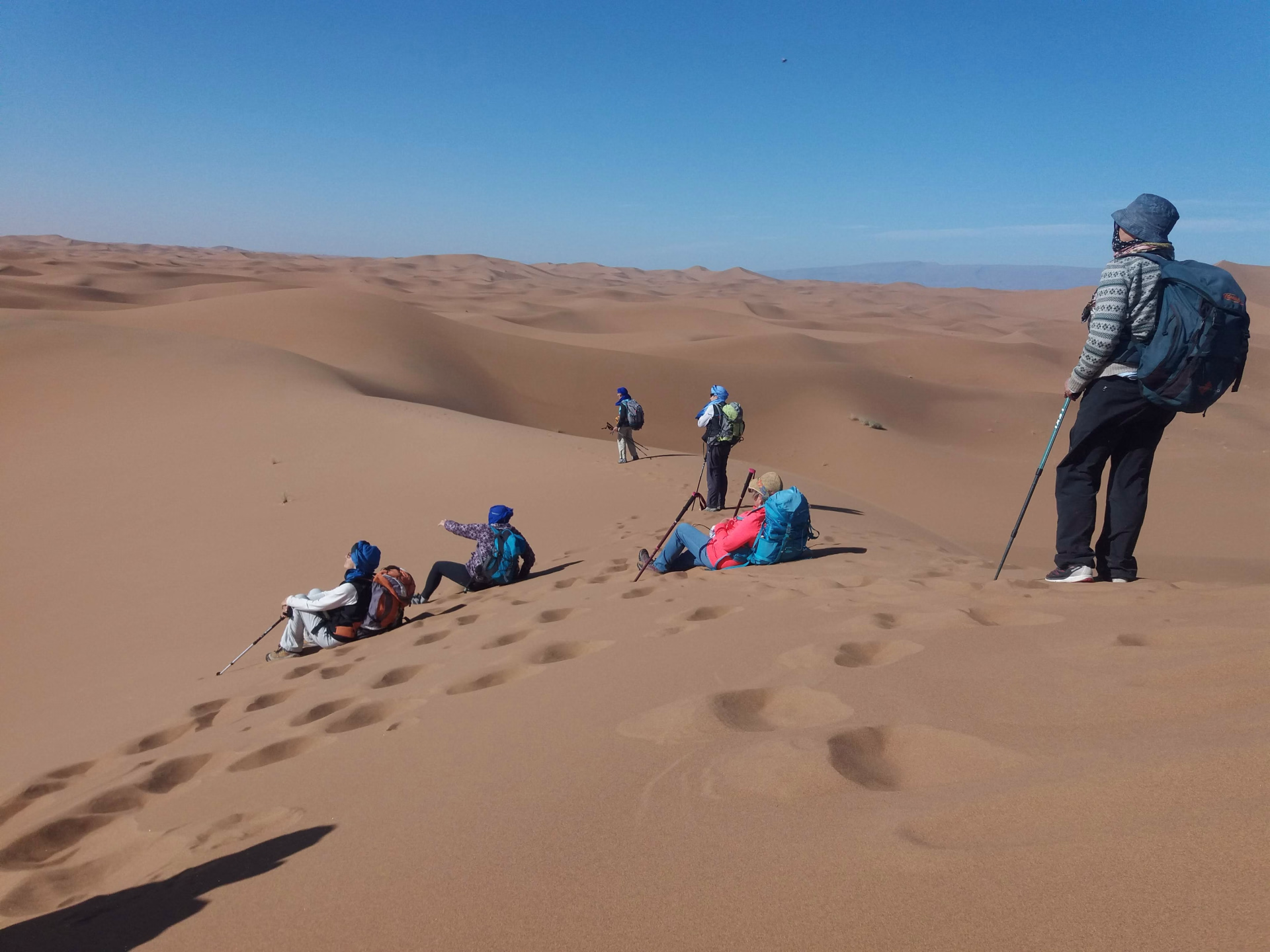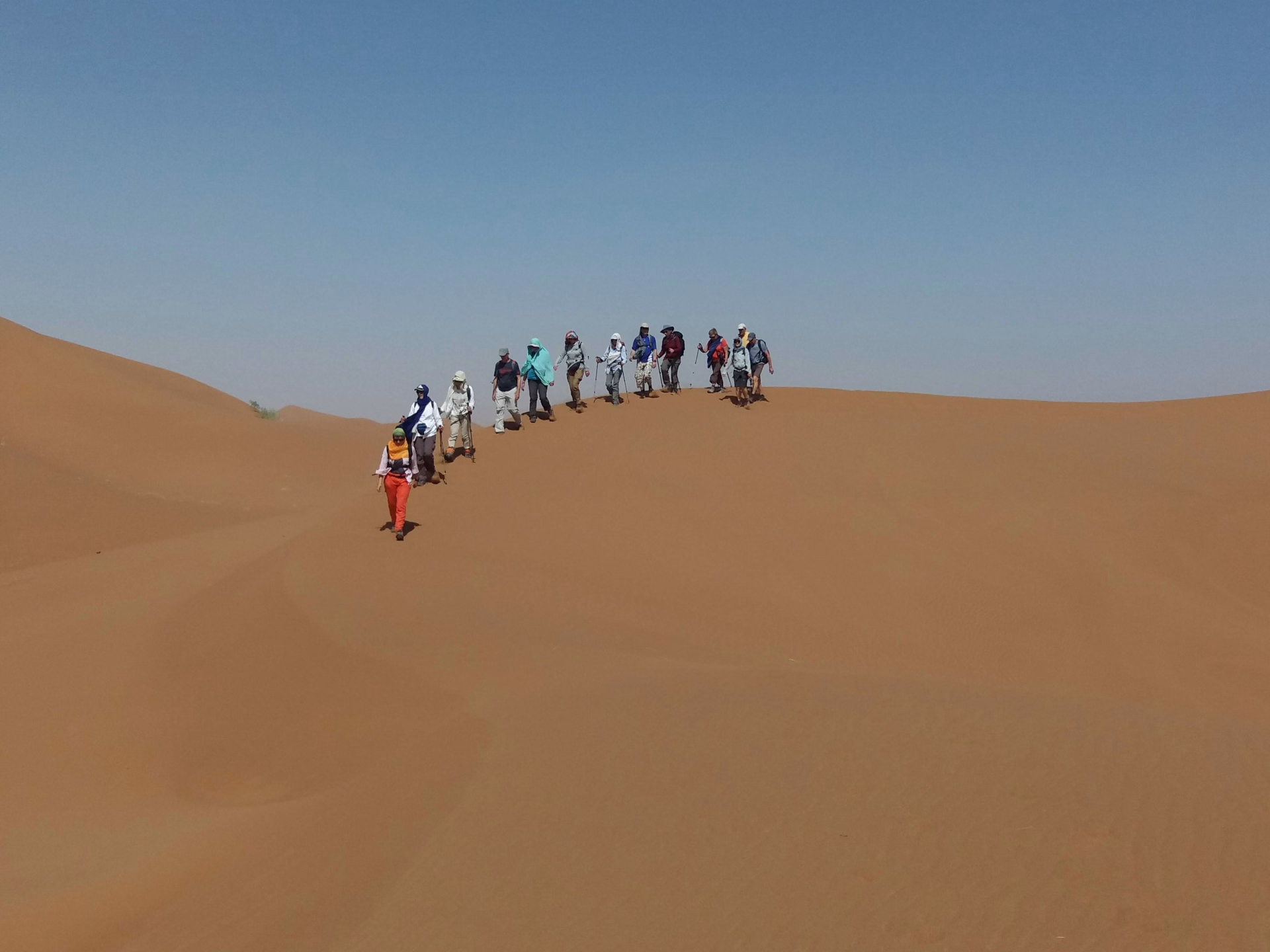Après un dernier lever de soleil sur les grandes dunes de Chegaga, la marche reprend en direction de l’ouest, à travers une zone de dunes mouvantes et de petites plaines sablonneuses.