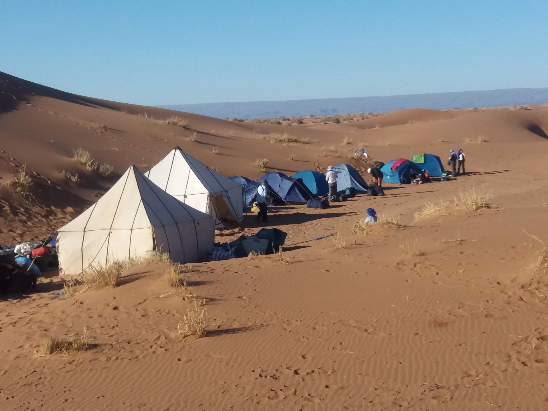 Installation du dernier bivouac au pied des grandes dunes, dîner sous les étoiles, et soirée paisible dans le silence du désert.