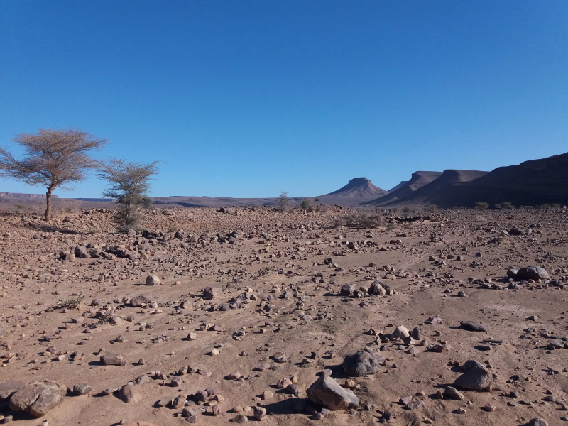 Après le petit-déjeuner, la marche reprend à travers les paysages ouverts du plateau désertique, appelé reg, où le sol caillouteux s’étend à perte de vue. Le silence du désert est seulement ponctué par le vent et le pas lent des dromadaires.