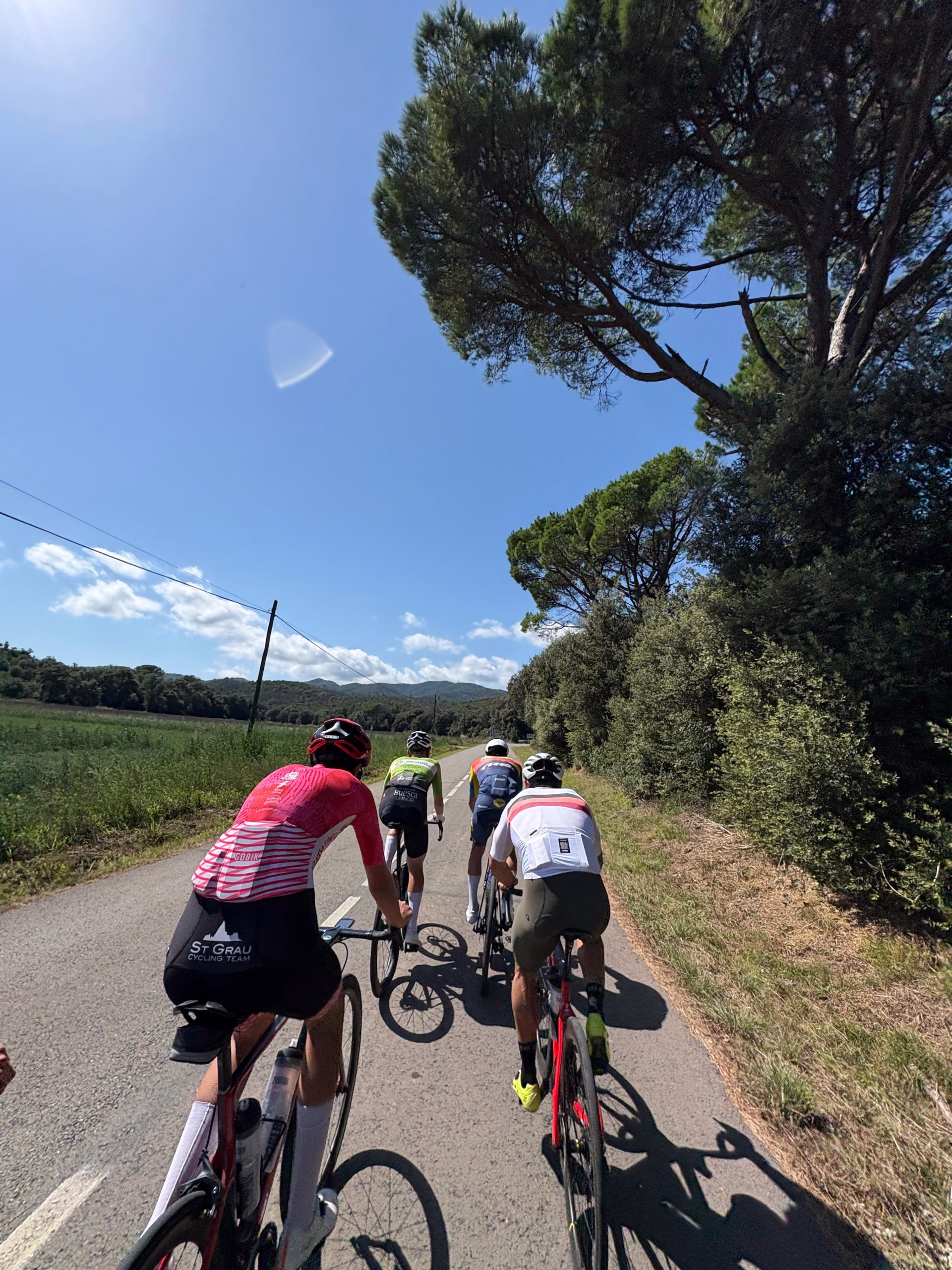 L’itinéraire commence par l’ascension douce et régulière de Santa Pellaia, une montée forestière très appréciée des cyclistes locaux. La route descend ensuite vers La Bisbal, au cœur de l’Empordà, où les paysages ruraux et les villages de pierre composent un décor typique et apaisant. Le retour vers Platja d’Aro se fait en passant par Calonge et ses collines roulantes, parfaites pour maintenir un rythme agréable et profiter de la dynamique du groupe.