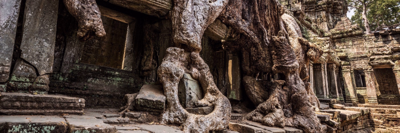 Poursuivez votre visite du Temple du Bayon, unique pour ses 54 tours décorées avec de plus de 200 visages souriants de Avolokitesvara. Vous pédalez vers Ta Prohm, peut-être plus connu sous le nom de "Tomb Raider". Ce magnifique temple de la jungle est considéré comme l'un des joyaux d'Angkor, avec ses racines d'arbres géantes entrelacées parmi les énormes blocs de pierre du temple, qui nous donnent une impression de "la ville oubliée