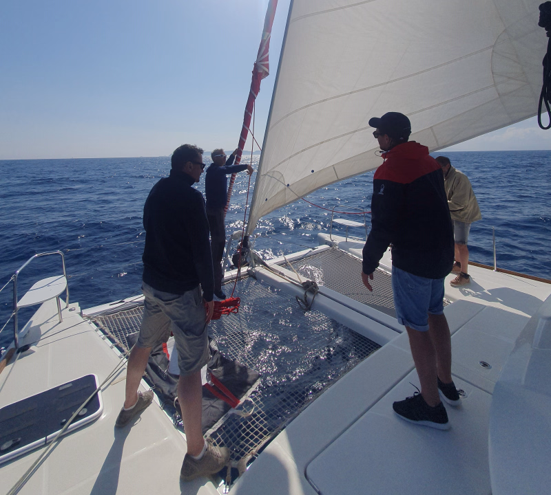 Plongez au cœur de notre formation niveau 1 en navigation de plaisance, une immersion progressive pour acquérir toutes les bases nécessaires à la prise en main d’un catamaran habitable en sécurité. Du jour 2 au jour 5, vous évoluez en pleine mer et apprenez à manœuvrer, comprendre l’environnement marin, maîtriser les règles de route et développer les réflexes essentiels à la navigation à la voile.