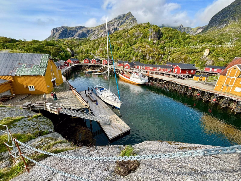 Chaque matinée débute par un petit-déjeuner consistant avant de diviser vos journées entre navigation à la voile et sessions de randonnée. L'itinéraire reste flexible pour s'adapter à la météo norvégienne et vous garantir les meilleures conditions de pratique. Vous alternez entre des mouillages sauvages en pleine nature et des escales dans des villages emblématiques de l'archipel comme Reine, Henningsvaer ou le spectaculaire Trollfjord. Les déjeuners sont pris à bord ou sous forme de pique-nique lors de vos explorations à terre. En fin de journée, le voilier devient un espace de détente privilégié pour la contemplation des fjords avant de passer la nuit à l'ancre dans une baie isolée ou à quai dans un port de pêche. Vous regagnez le port final le vendredi soir.