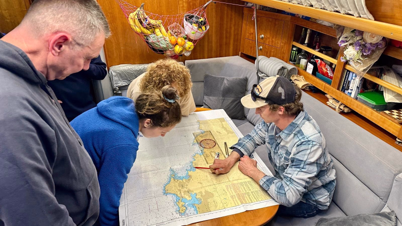 Briefing Manoeuvres de port et gestion d'équipage. Exercices manœuvres de port. Navigation (réglages de voile, tenue de cap, veille météo, estime de route...) Mouillage, débriefing.
