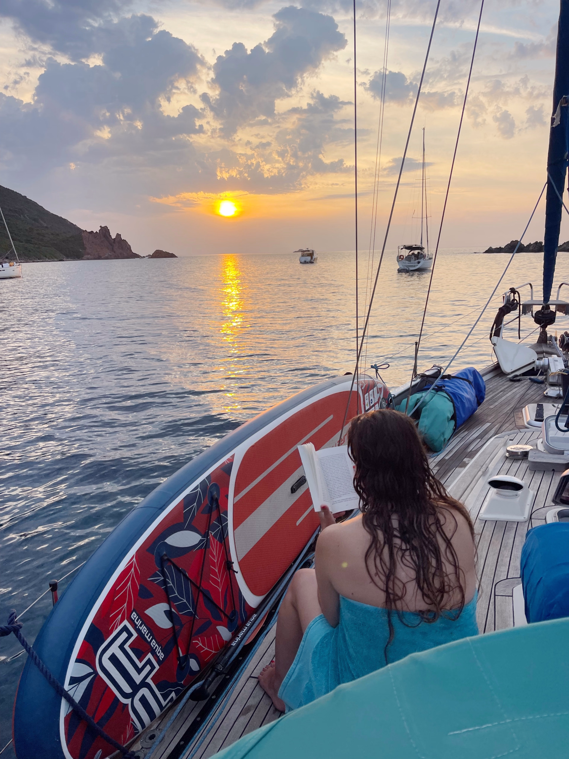 Selon l’ancrage de la veille, cette matinée offre deux possibilités. Si vous êtes encore au mouillage hors d’Ajaccio, vous profitez d’un dernier bain matinal suivi d’une courte navigation de retour. Si le bateau est déjà revenu au port ou à la bouée, Céline vous propose un dernier cours de yoga pour clôturer le séjour en douceur. L’expérience se termine en fin de matinée, le temps de ranger et de se dire au revoir, avant de retrouver la terre ferme.