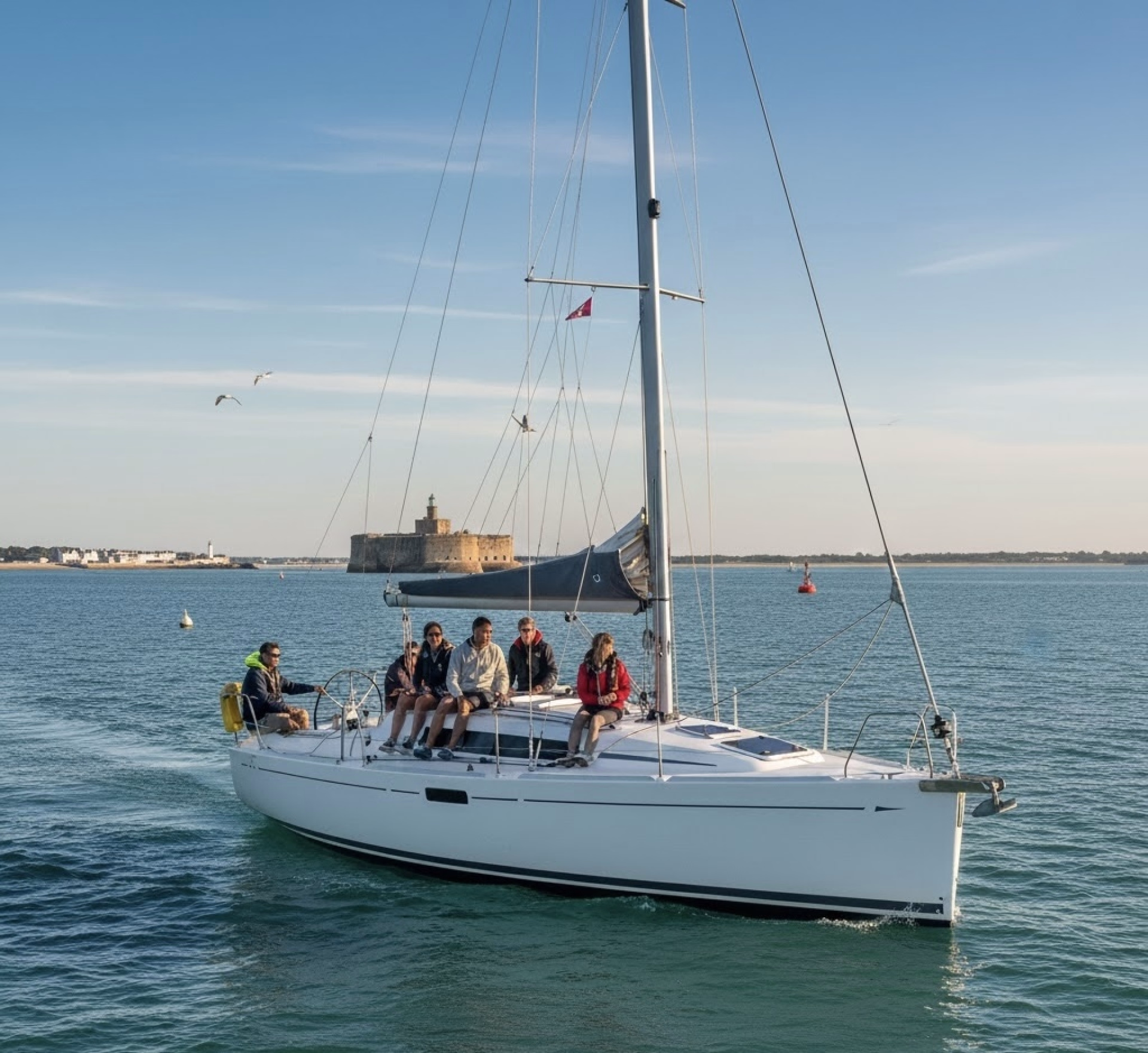 Bienvenue au port des Minimes de La Rochelle, véritable emblème de la plaisance atlantique. Votre moniteur vous accueille à 9h30 pour faire connaissance, vous présenter le voilier et lancer ce week-end de navigation ! Dès les premières manœuvres, vous mettez le cap vers l’Île d’Aix, petite île pleine de caractère et de récits maritimes. À proximité se dresse l’incontournable Fort Boyard, monument emblématique qui semble surgir de la mer.