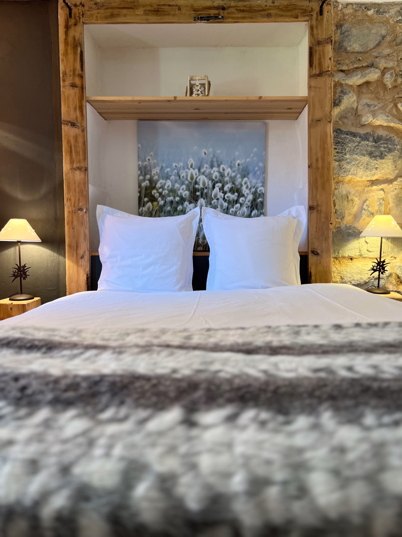 - Fleur de Mélèze : Suite de 22m2 vue sur les montagnes (1 lit double ou 2 lits simples) / Idéal pour les couples ou pour 2 personnes qui ne se connaissent pas et veulent de l'espace.