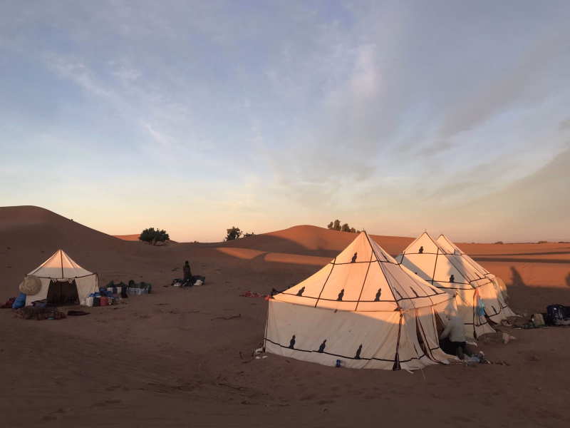 Vous dormirez dans un bivouac nomade installé au milieu des dunes du Sahara marocain