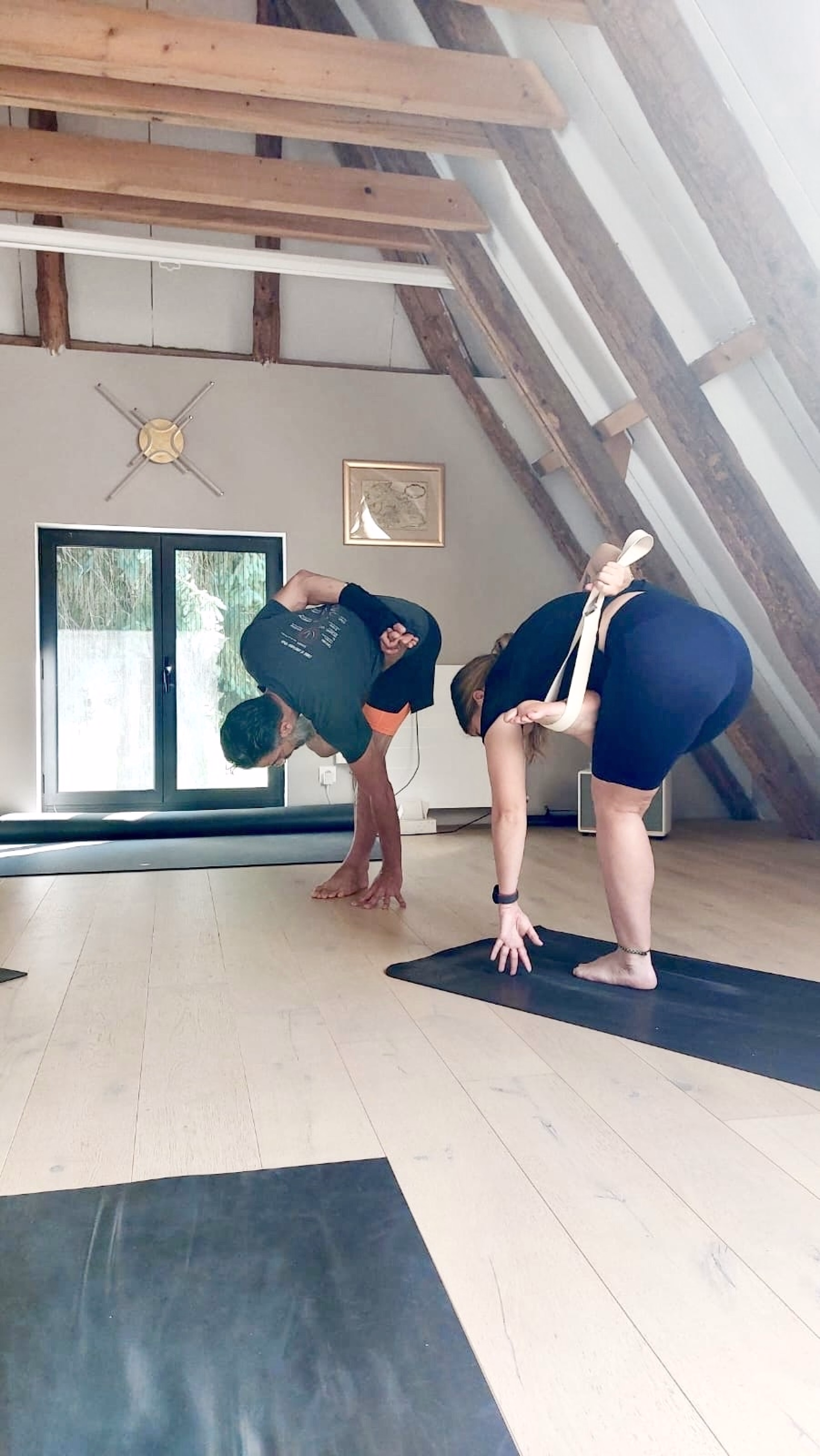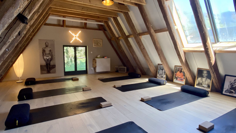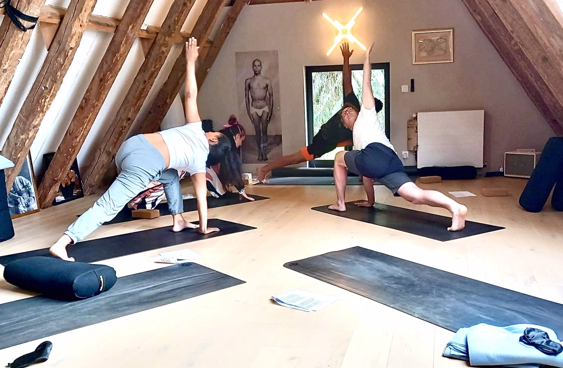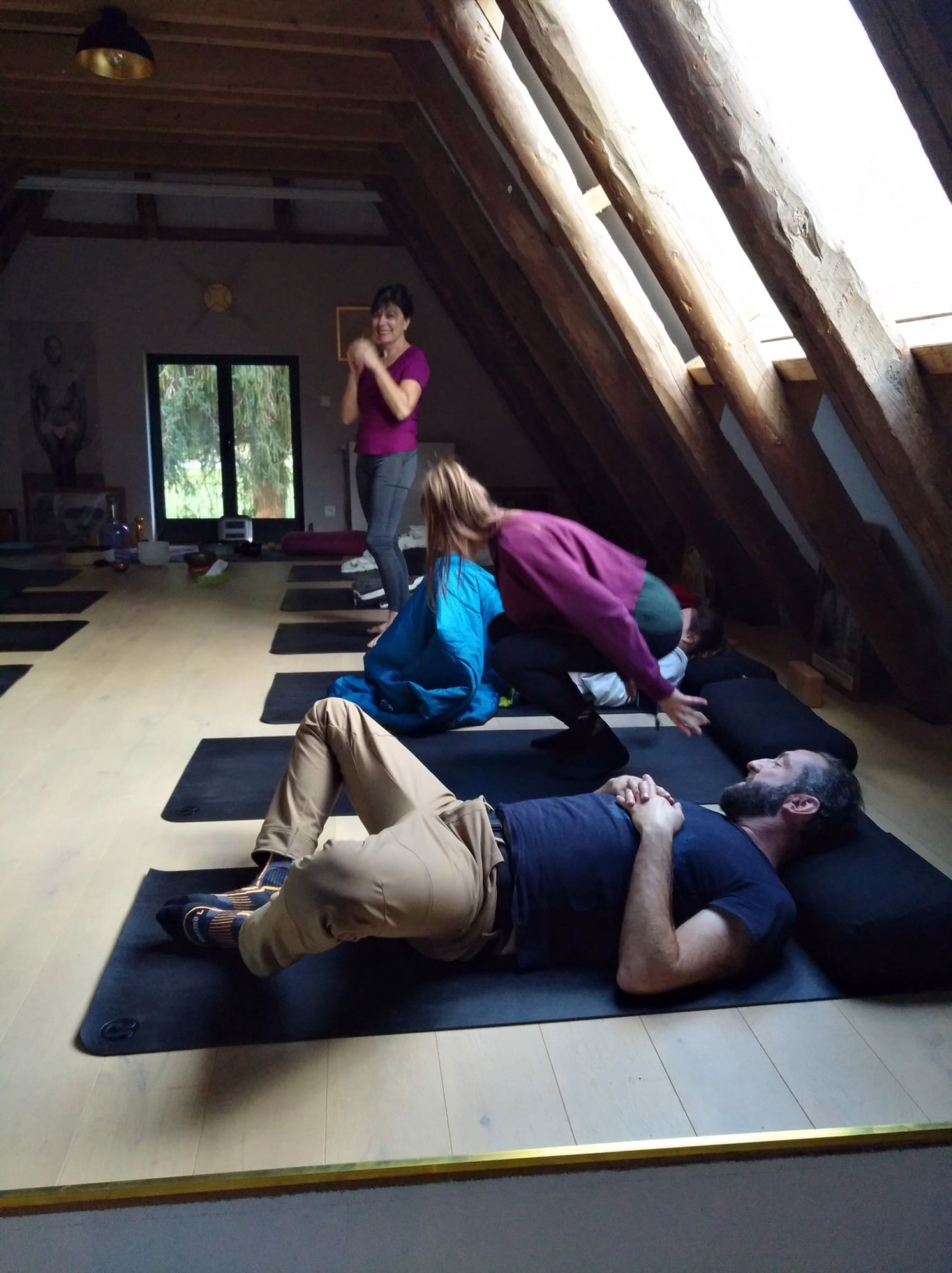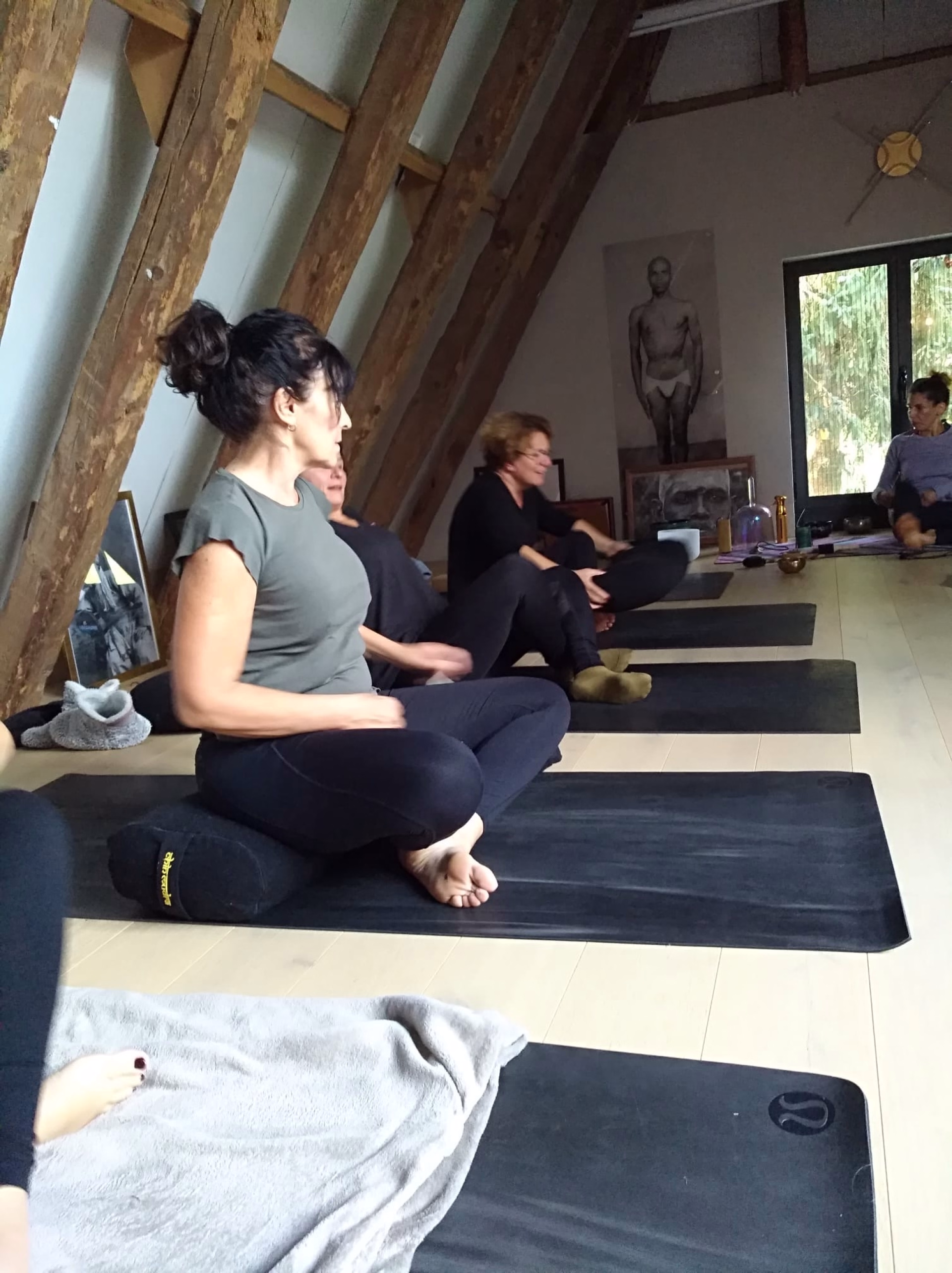 - Tapis de Yoga + briques, sangles, bolsters, rouleaux de massage, plaid.