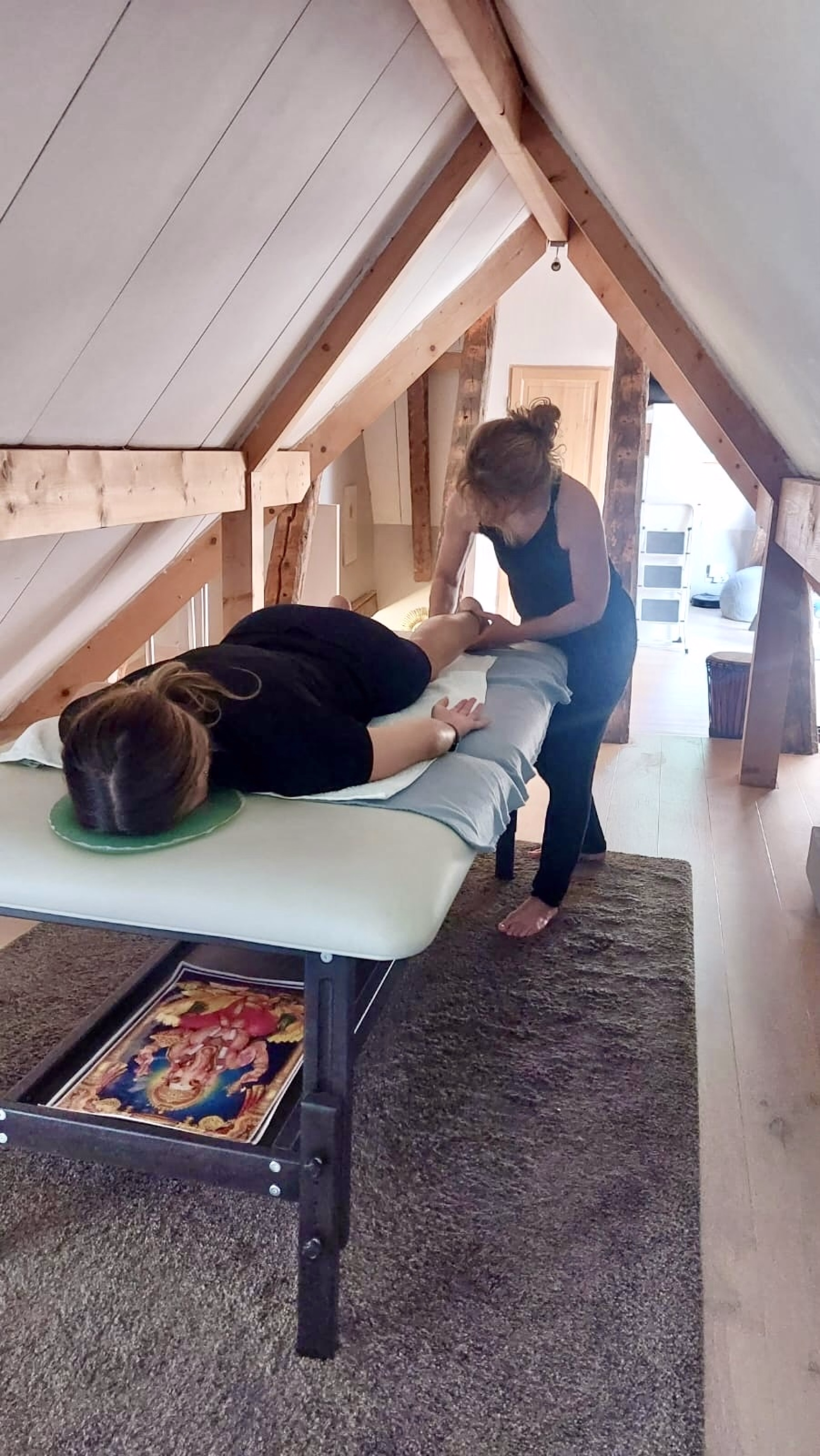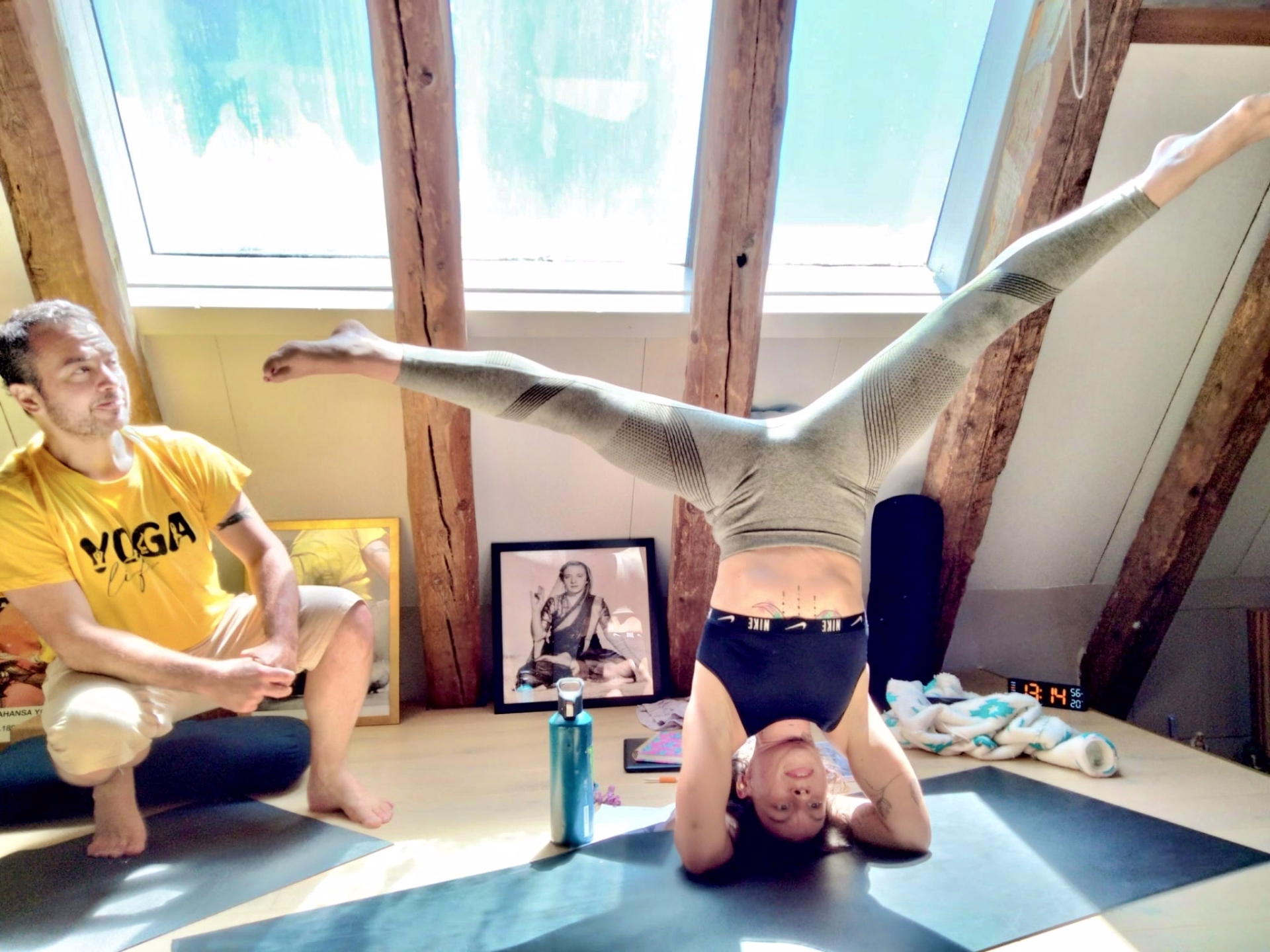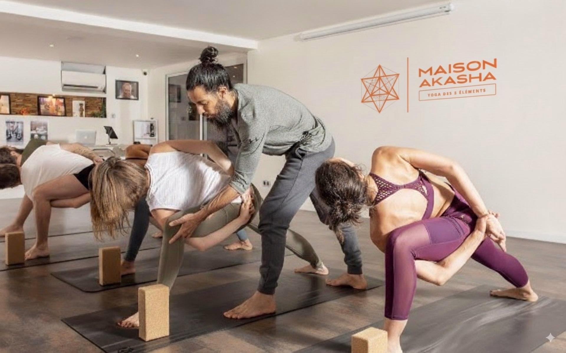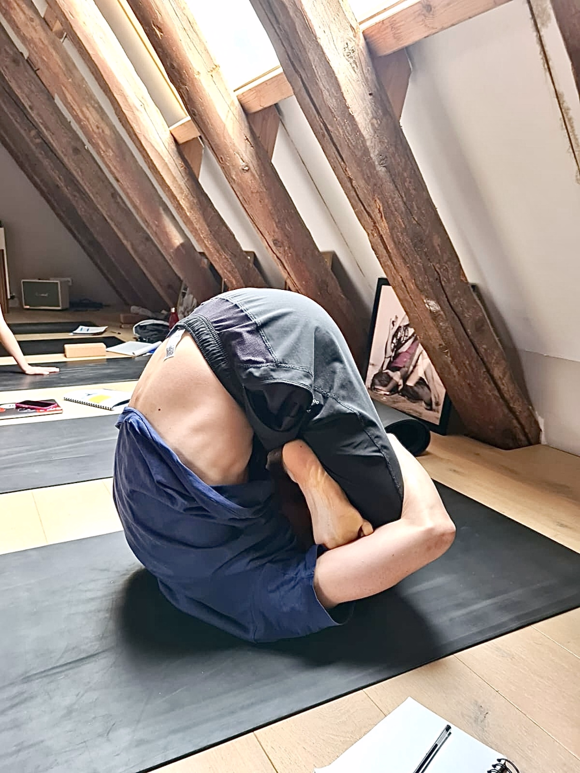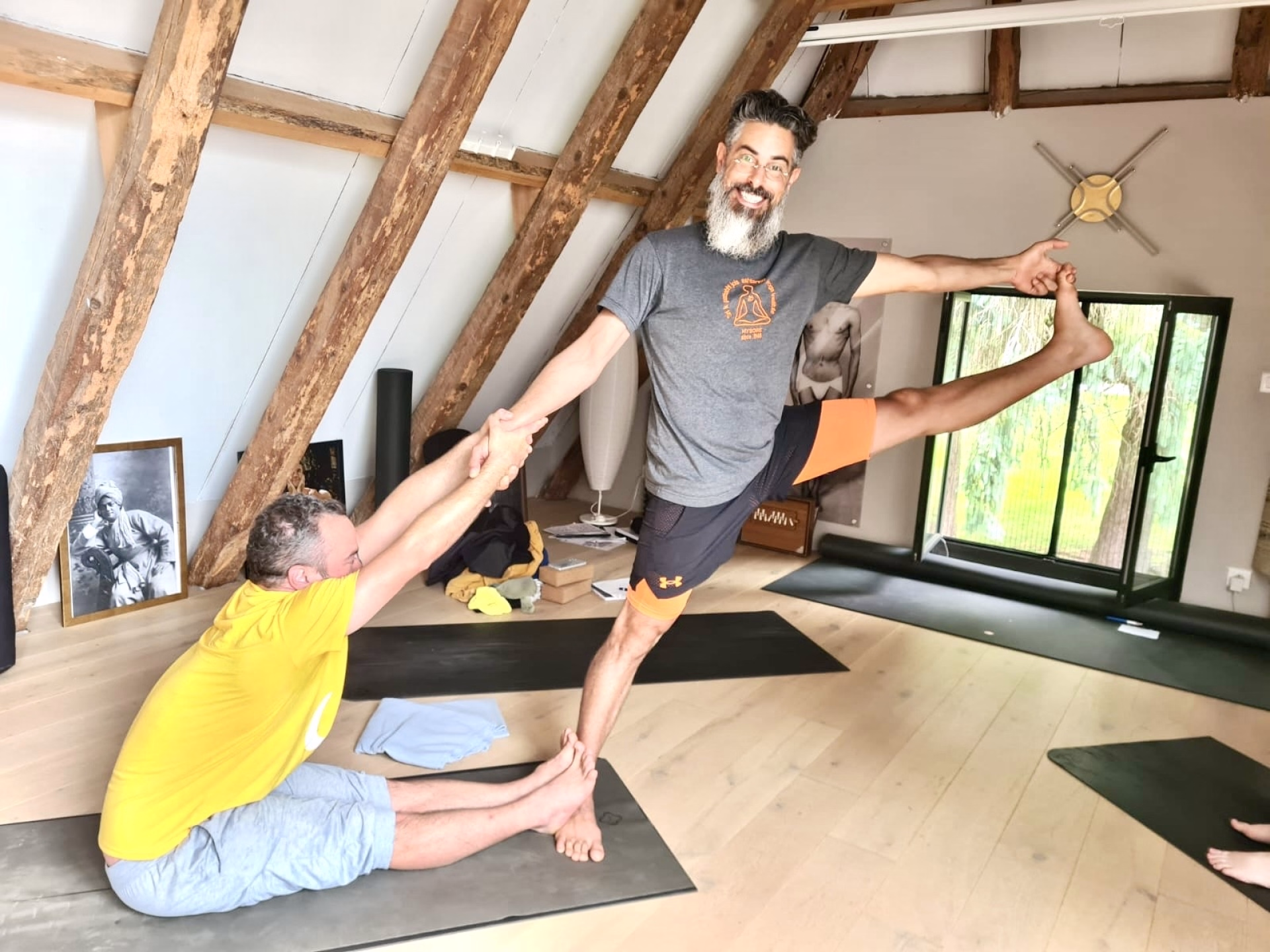 - Tapis de Yoga + briques, sangles, bolsters, rouleaux de massage, plaid.