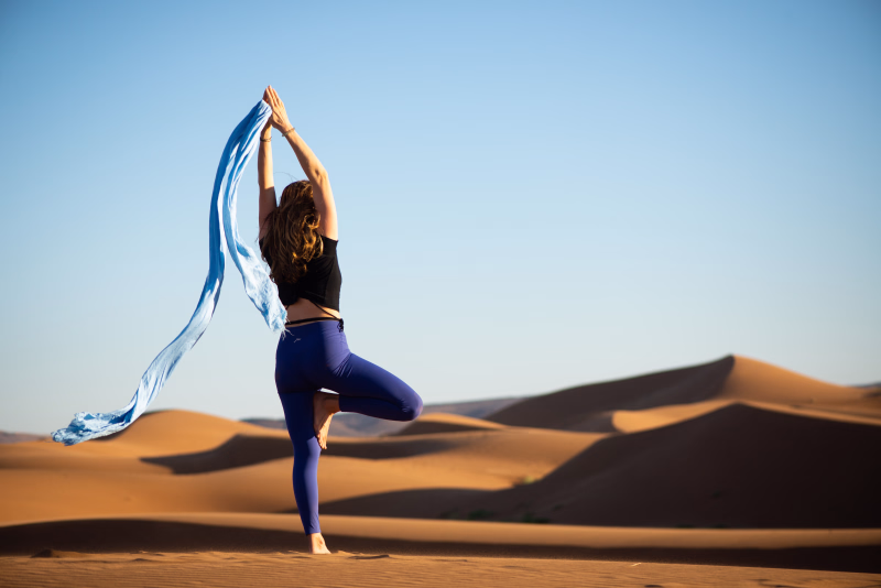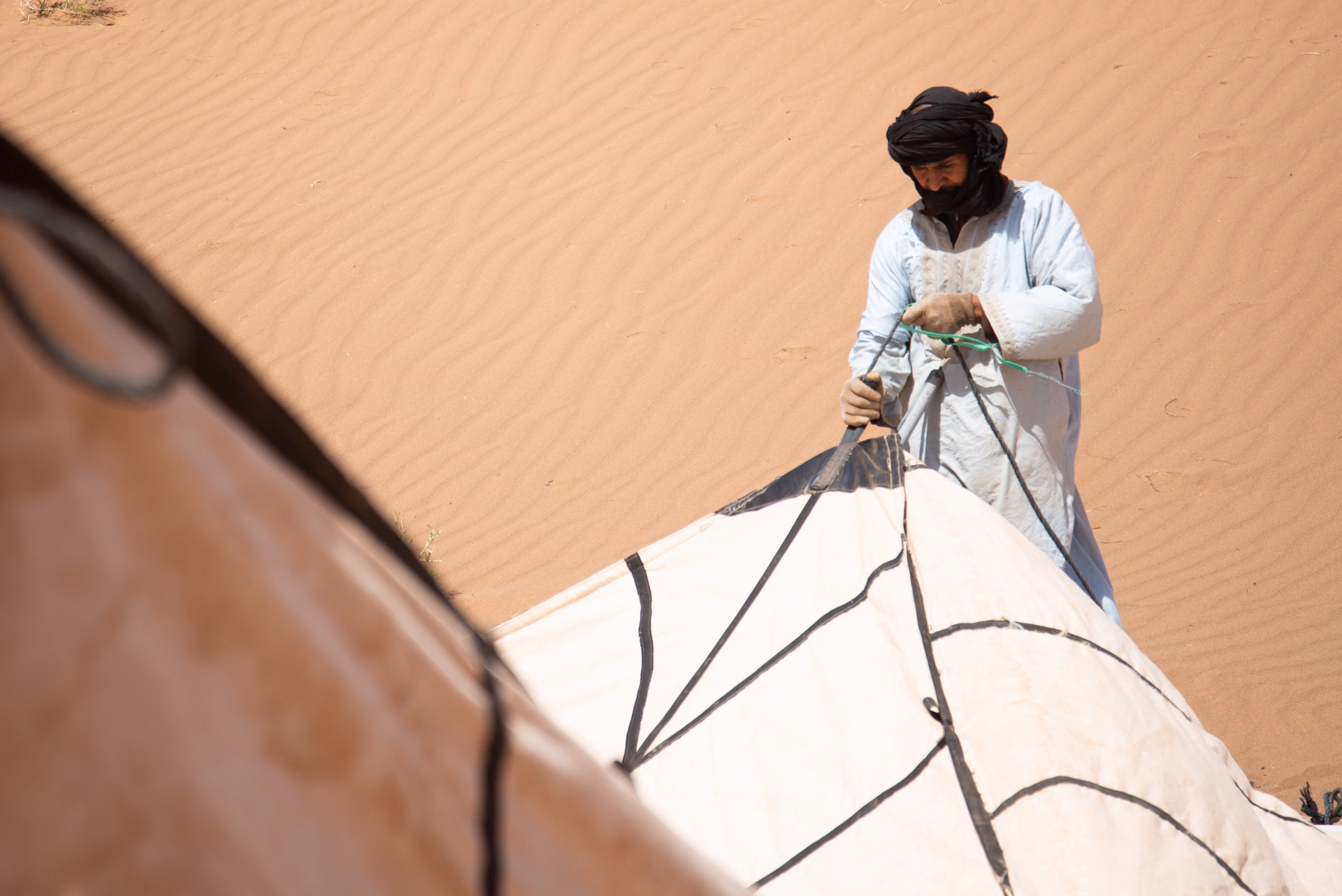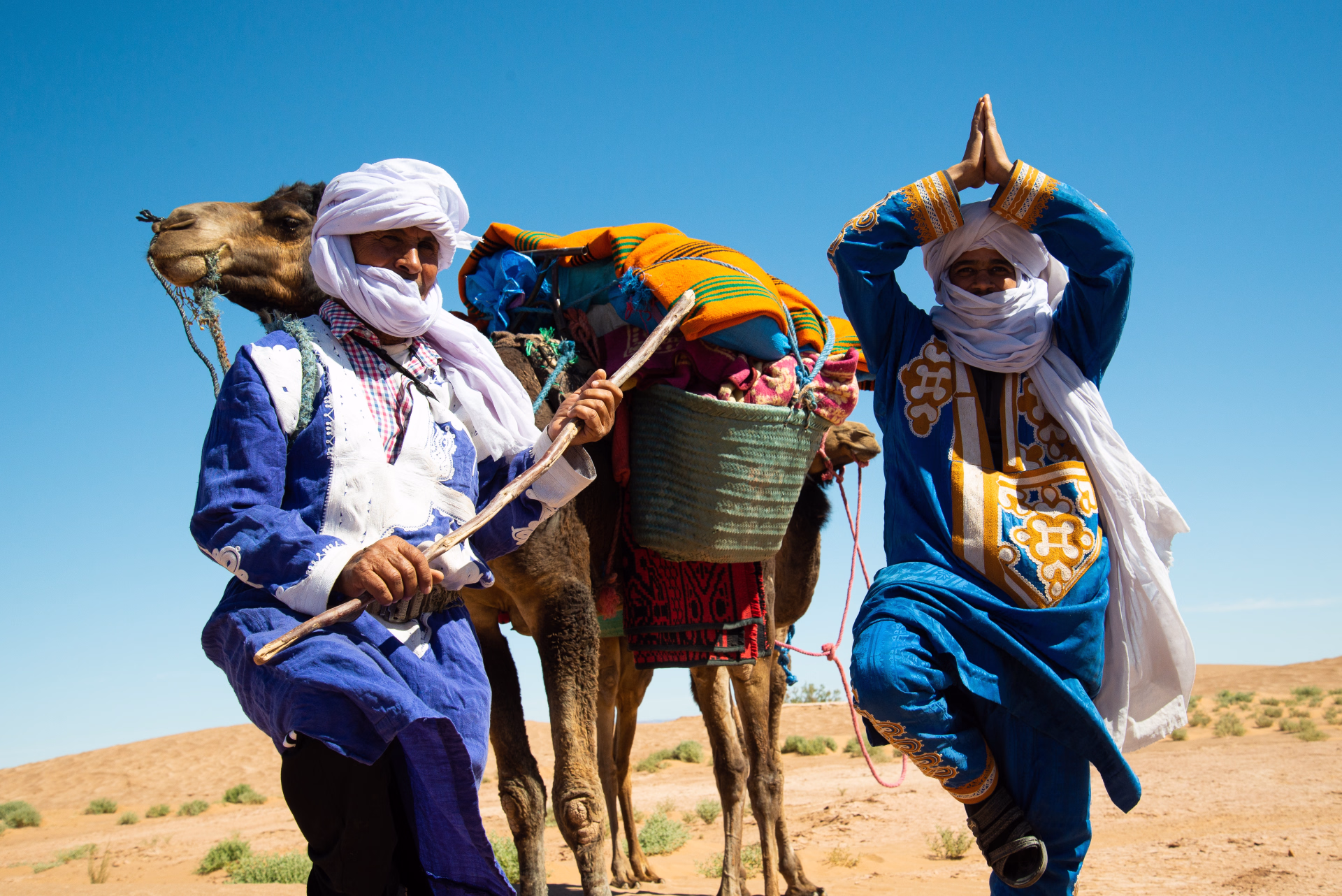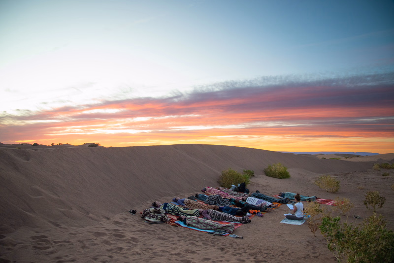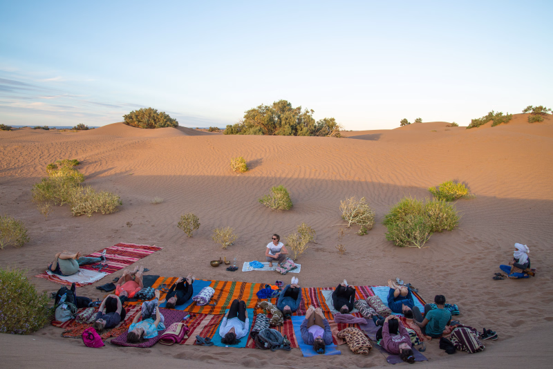 Depuis M’Hamid, une marche facile (20 minutes) vous conduira à votre bivouac, installé en pleine nature, où vous rencontrerez votre équipe de nomades et profiterez d’une première séance de yoga.